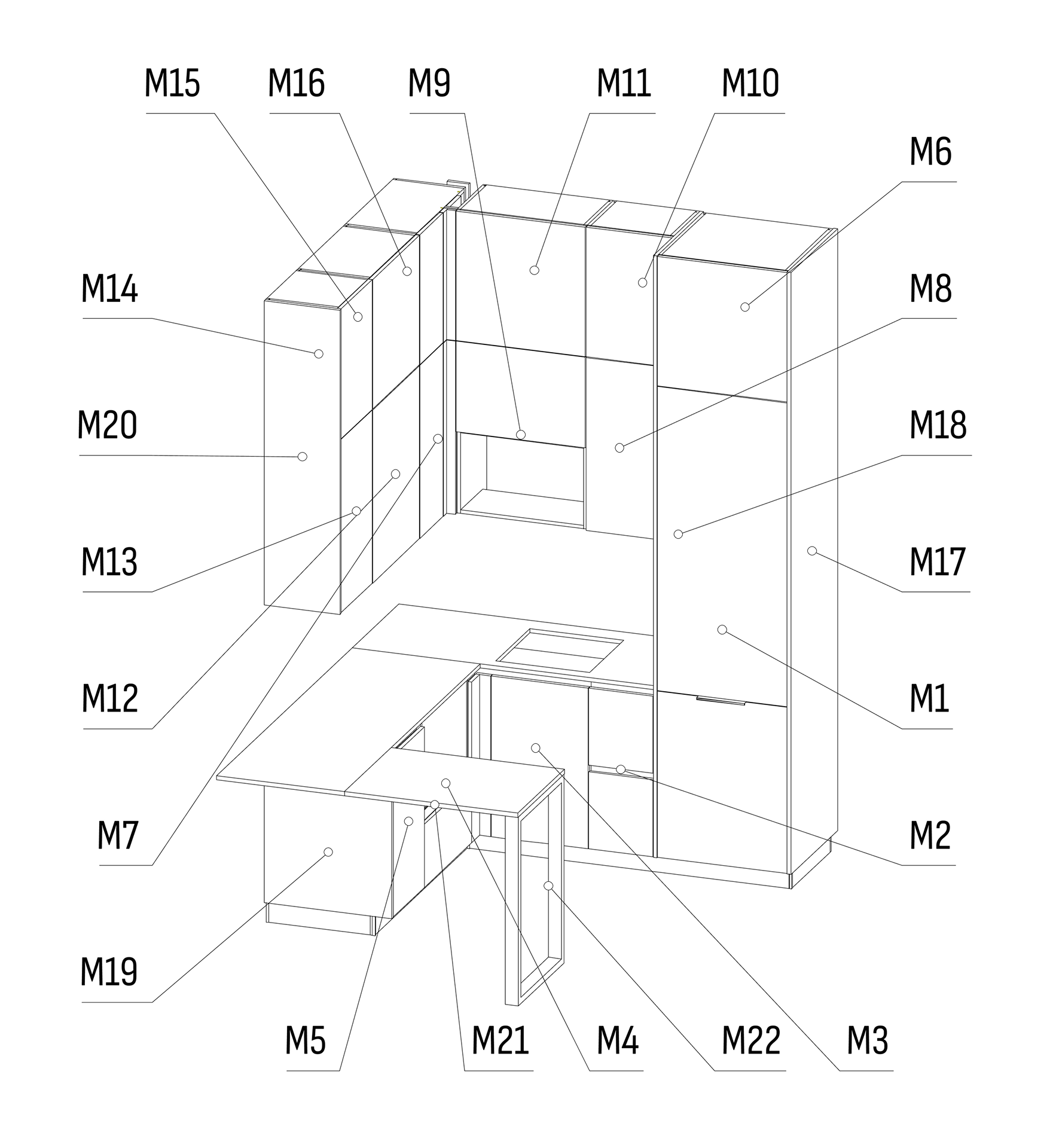 * Интегрированная обеденная зона || Кухня плавно переходит в полуостров-стол (1390 х 890 мм), который служит зонирующим элементом.