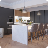 Фасады выполнены из ДСП графитового цвета. Вместо обычных ручек встроена ручка-профиль цвета «золото». Центральное место в планировке занимает большой кухонный остров, призванный стать практичным и социальным центром комнаты с винным холодильником и несколькими зонами отдыха. Пеналы включают в себя микроволновую печь AEG и духовку AEG.