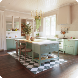 Эмберли. Изумрудная кухня с горчичным буфетом.